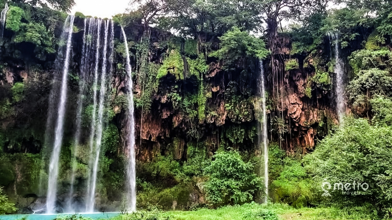 The waterfall is surrounded by limestone cliffs and green nature, making it ideal for photography and relaxation. Families come for picnics while children play in the shallow pools.